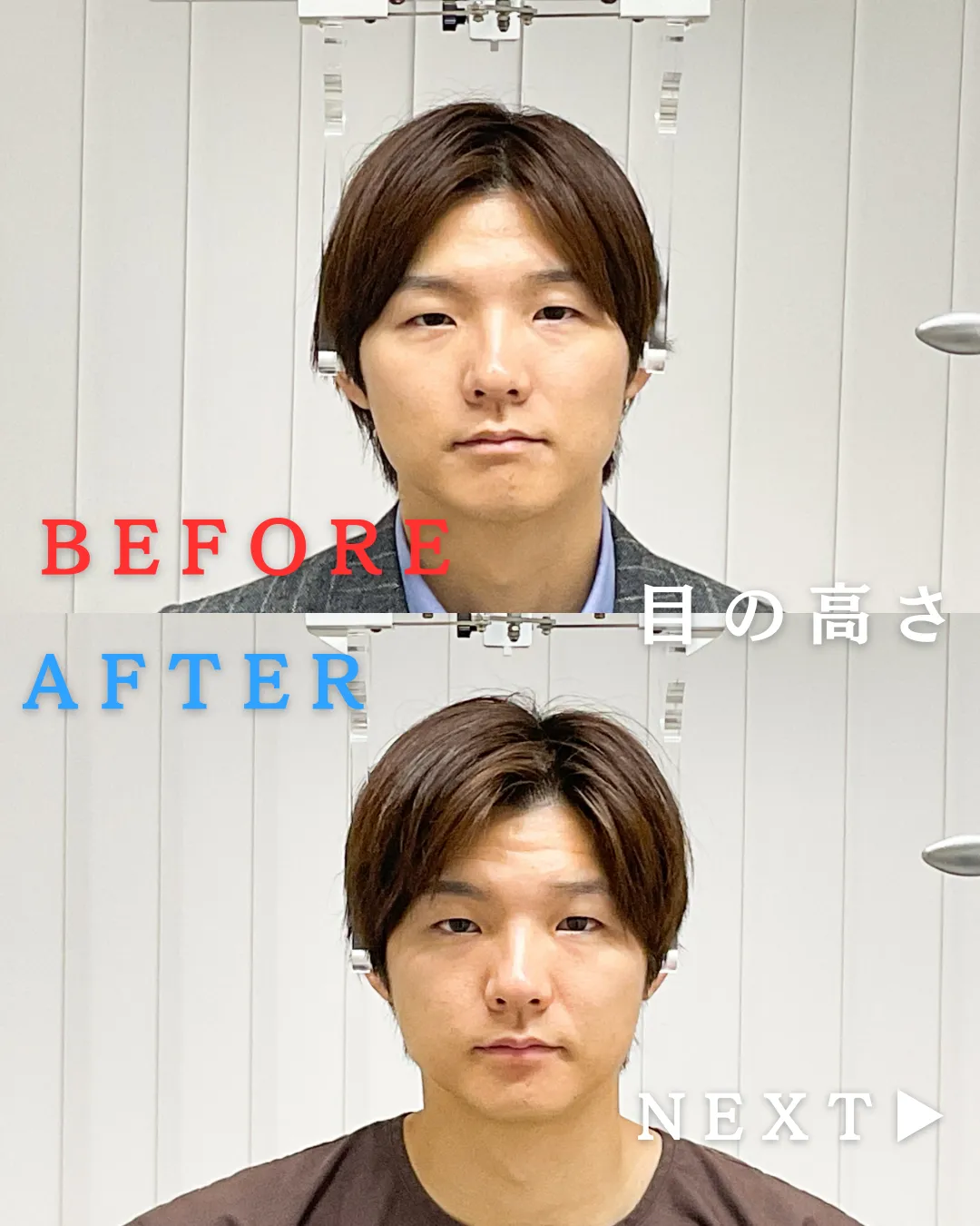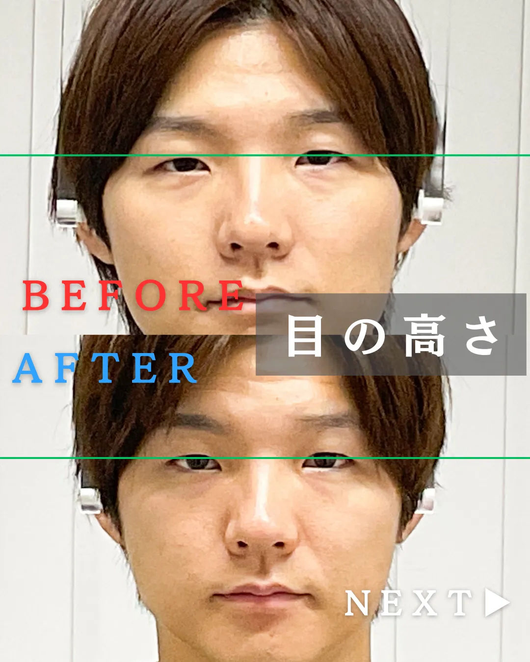 目の高さbefore、afterailes式 新宿・渋谷・食いしばり・骨盤矯正・小顔矯正・顎関節症・顔の左右差ならailesシンメトリー矯正院